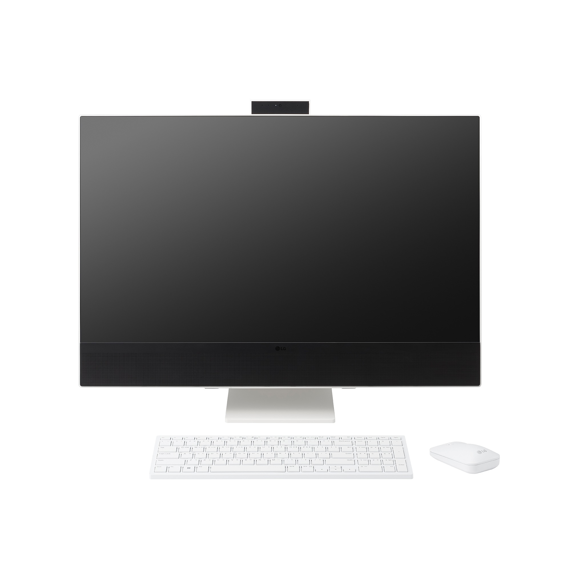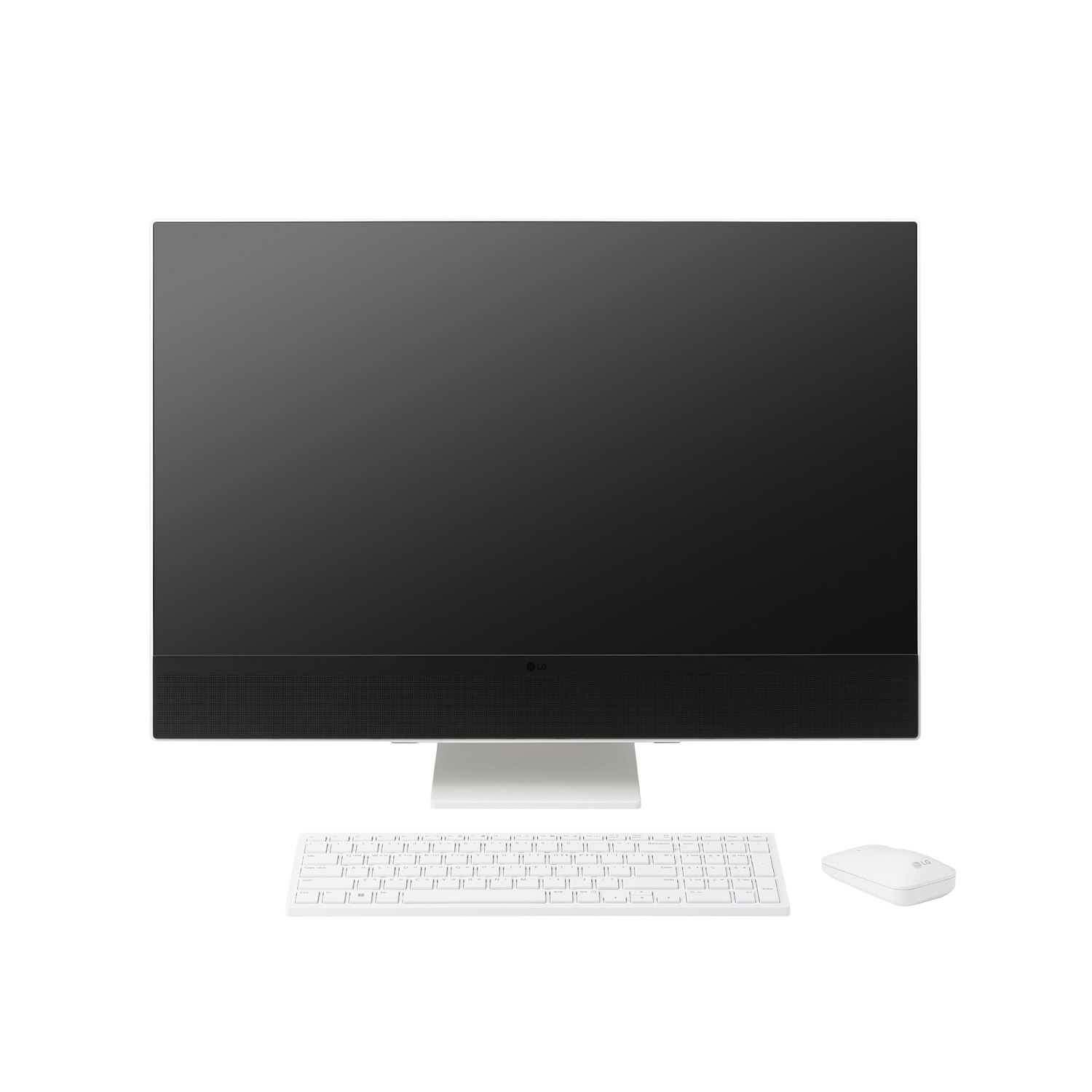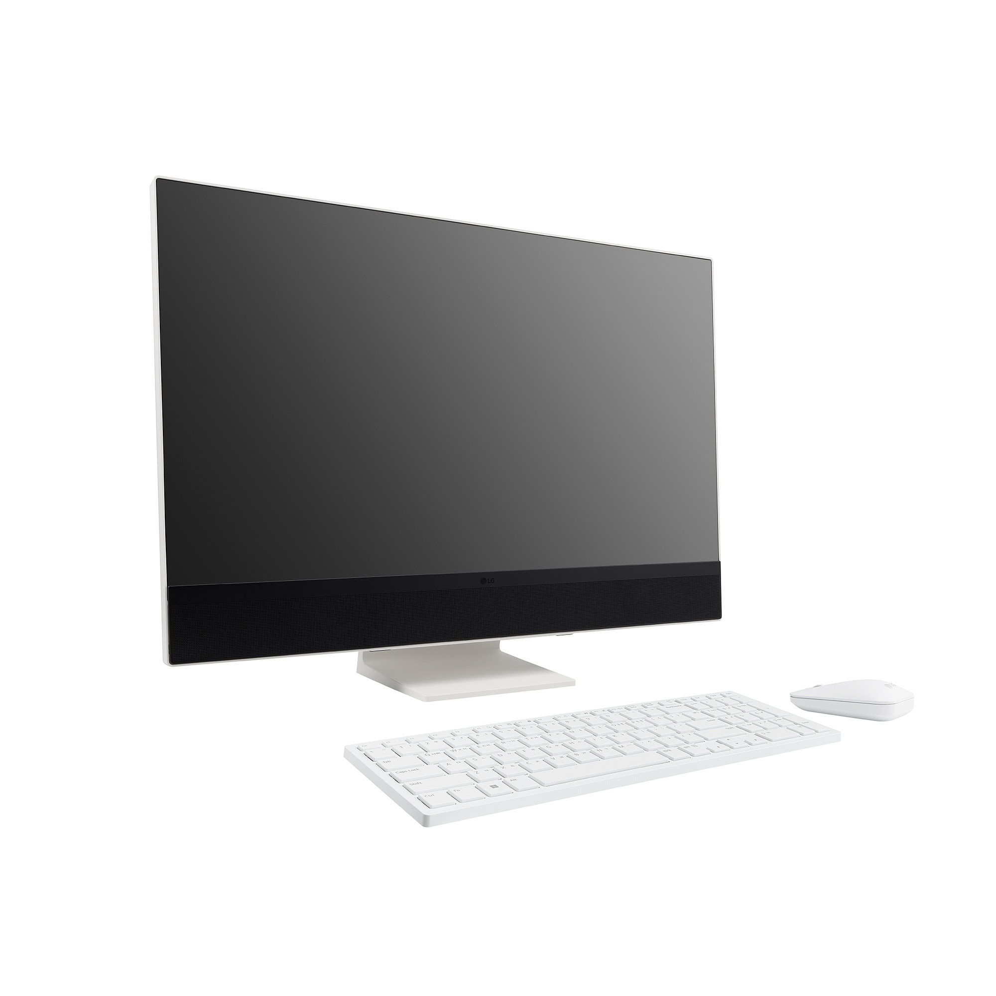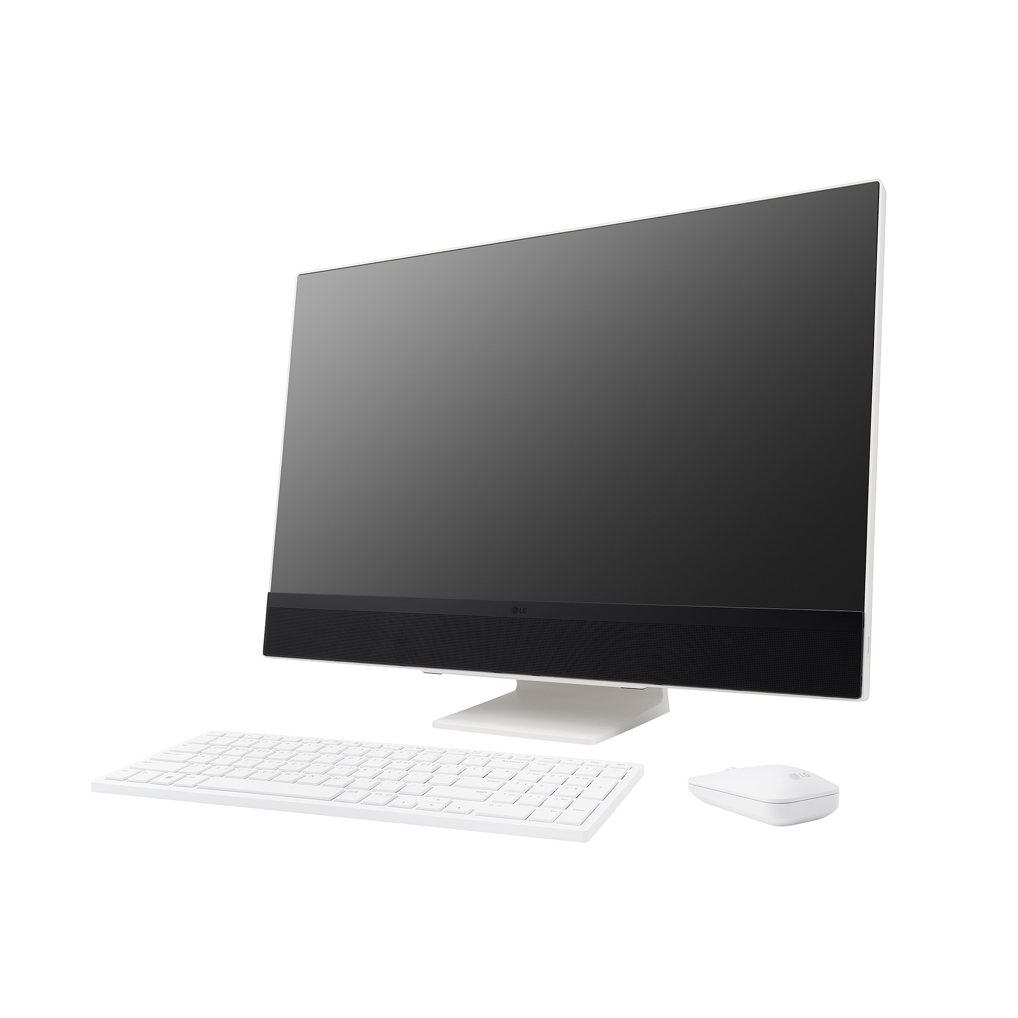공간과 하나되는 디자인의 LG 일체형 PC가 소개되어 있습니다. 공간과 하나되는 디자인, 어느 각도에서도 선명한 디스플레이, 최신 성능과 편리한 업그레이드, 세심한 편의성이라는 문구가 포함되어 있습니다. 화면에는 자연 경관 이미지가 표시된 모니터와 키보드, 마우스가 놓여 있습니다.