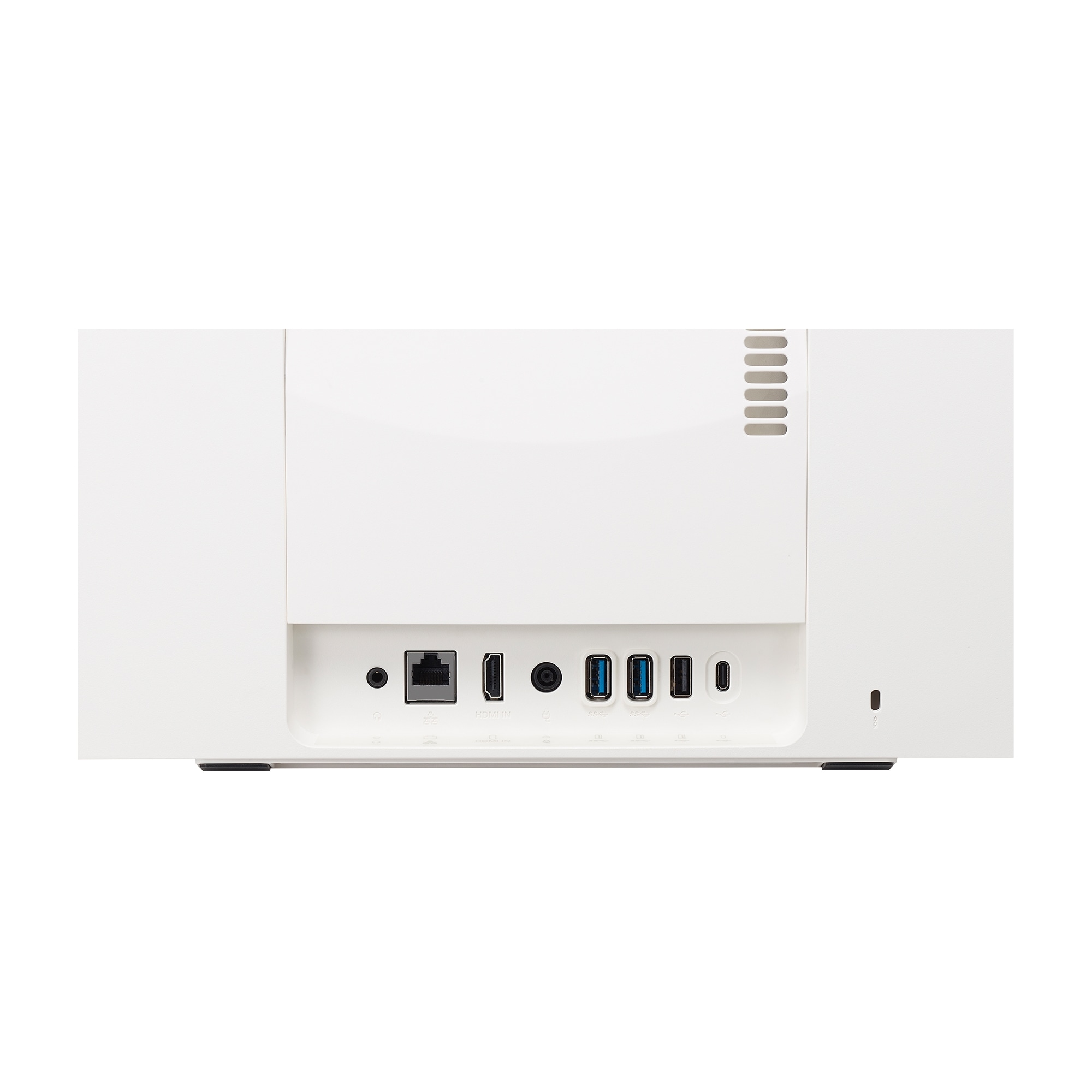 모니터의 후면과 측면이 보이며, 후면에는 다양한 포트가 있습니다. LAN 포트, HDMI IN 포트, USB 3.2 포트 2개, USB Type-C(출력전용) 포트, USB 2.0 포트, 켄싱턴 락이 있습니다. 측면에는 USB 2.0 포트가 있습니다. 모니터의 전체적인 색상은 흰색입니다.