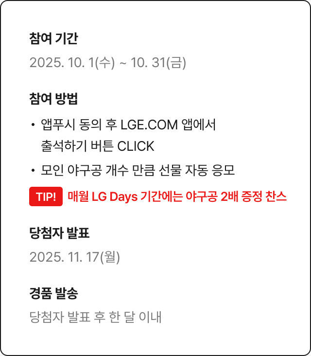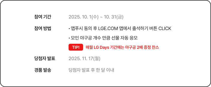 - 연락처 등 개인 정보 수정이 필요한 경우, 이벤트 기간 내에 LGE.COM 마이페이지에서 회원 정보 수정 완료하셔야 합니다.