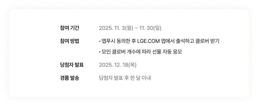 - 연락처 등 개인 정보 수정이 필요한 경우, 이벤트 기간 내에 LGE.COM 마이페이지에서 회원 정보 수정 완료하셔야 합니다.