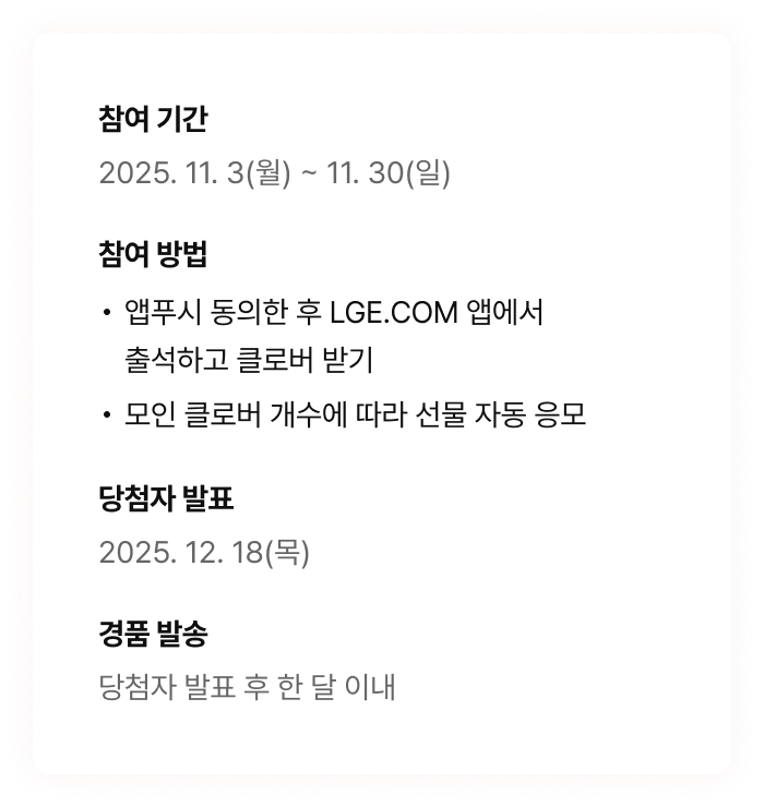 - 경품 지급은 LGE.COM에 등록된 회원 정보에 따라 진행됩니다.