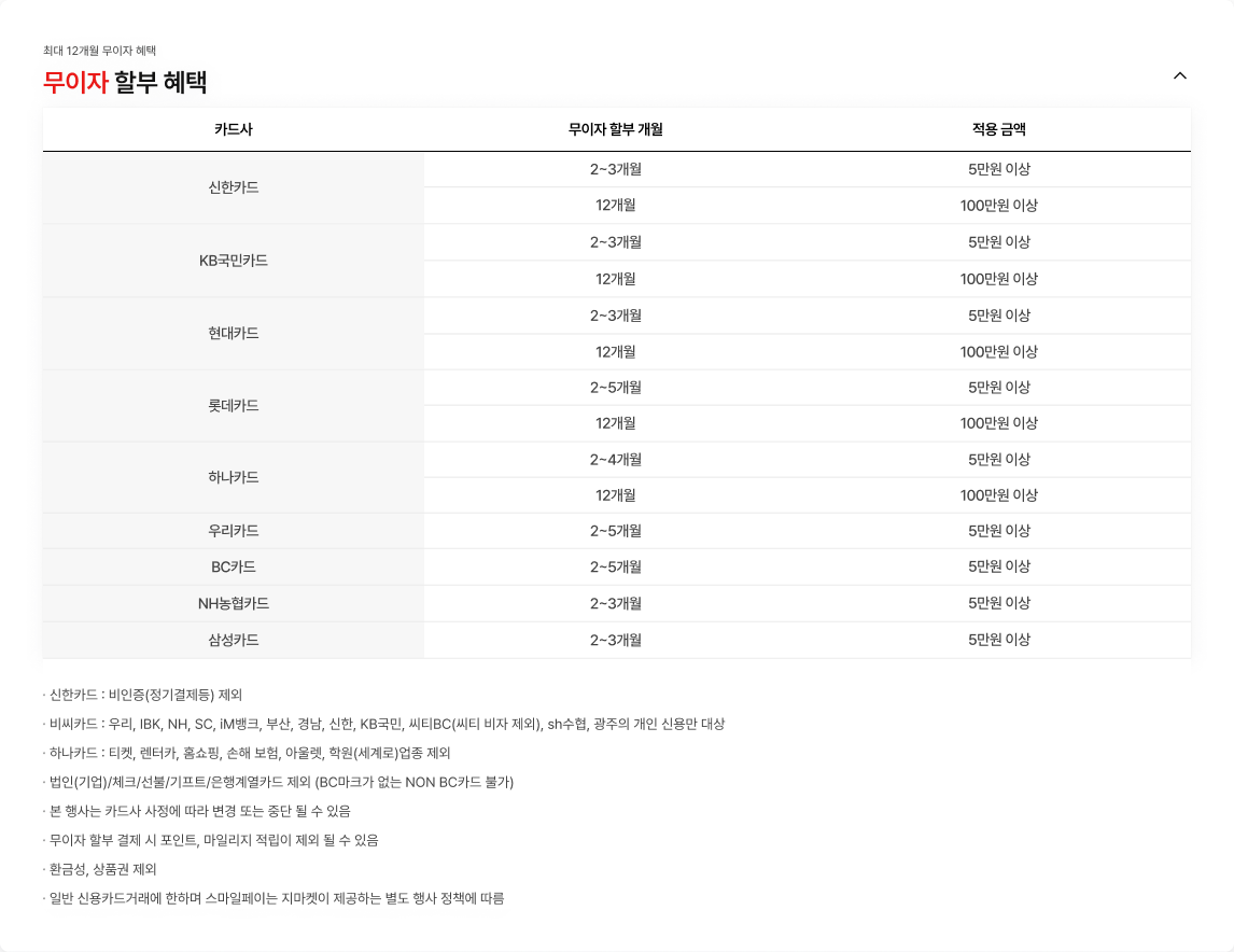 | 카드사 | 무이자 할부개월 | 적용 금액 |