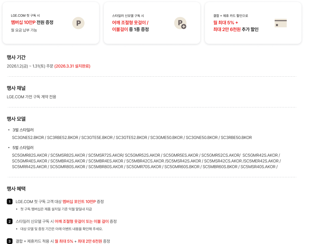 - 행사 혜택 LGE.COM 첫 구독 고객 대상 멤버십 포인트 10만P 증정 첫 구독 멤버십은 제품 설치일 기준 익월 말일 내 지급 월 요금 결제 가능한 LG전자 멤버십 포인트 최대 7만P 증정 결합 + 제휴카드 적용 시 월 최대 5% + 최대 2만 6천원 증정 스타일러 모델 구독 시 이불케어 추가 증정 대상 모델 및 증정 기간은 아래 이벤트 내용을 확인해주세요.