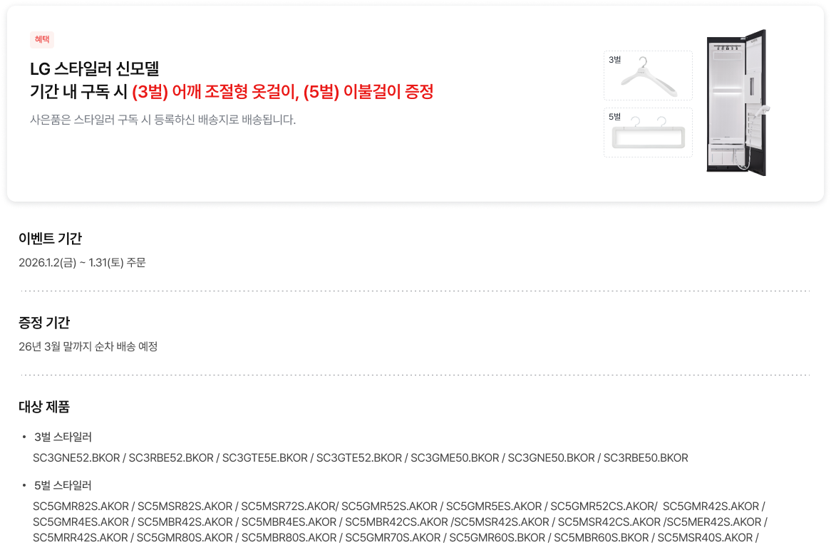 LG 스타일러 대상 모델 기간 내 구독 시 이불걸이 증정