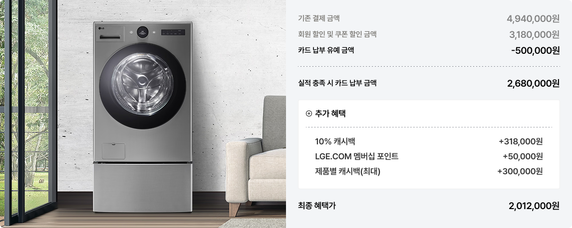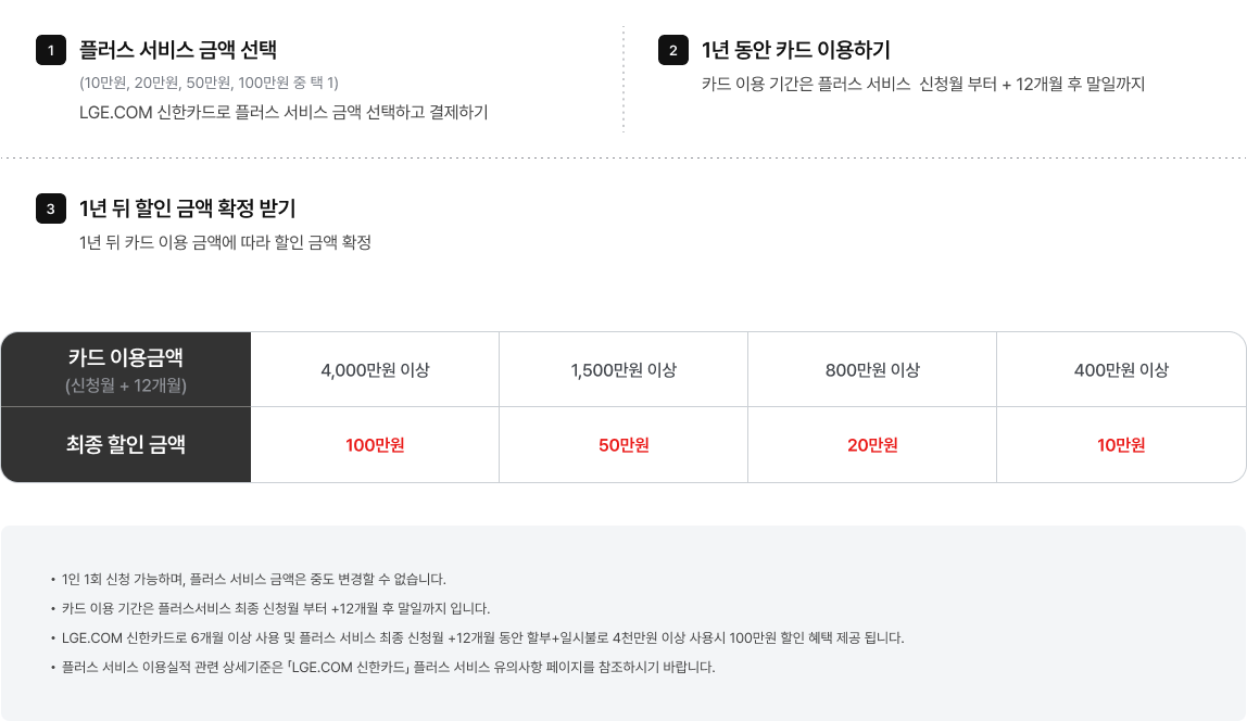 - LGE.COM 신한카드로 6개월 이상 사용 및 플러스 서비스 적용 신청월 +12개월 동안 할부∙일시불로 4천만원 이상 사용 시 100만원 할인 혜택 제공됩니다.