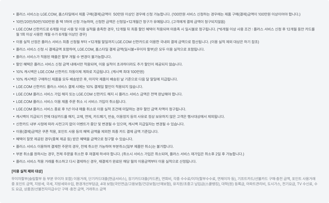 - 플러스 서비스 이용실적 관련 상세기준은 LGE.COM 신한카드, 플러스 서비스 유의사항 페이지를 참조하시기 바랍니다.