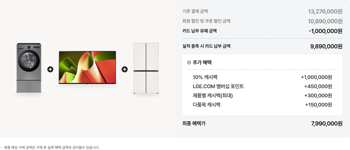 - 플러스 서비스 신청 시 결제금액 포함하여, LGE.COM, 홈스타일 결제금액(일시불+할부이자할부)은 모두 이용 실적으로 포함됩니다.