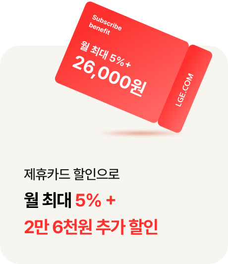 * 기존 결합할인은 신규 구독한 제품 6년 계약 시에만 해당되고 ( TV : 5년 계약 / 로봇청소기 : 4년 계약 ), 기존 보유 제품의 계약기간 유지 시점까지 할인 적용되며, 제품군 별 할인율은 상이합니다.