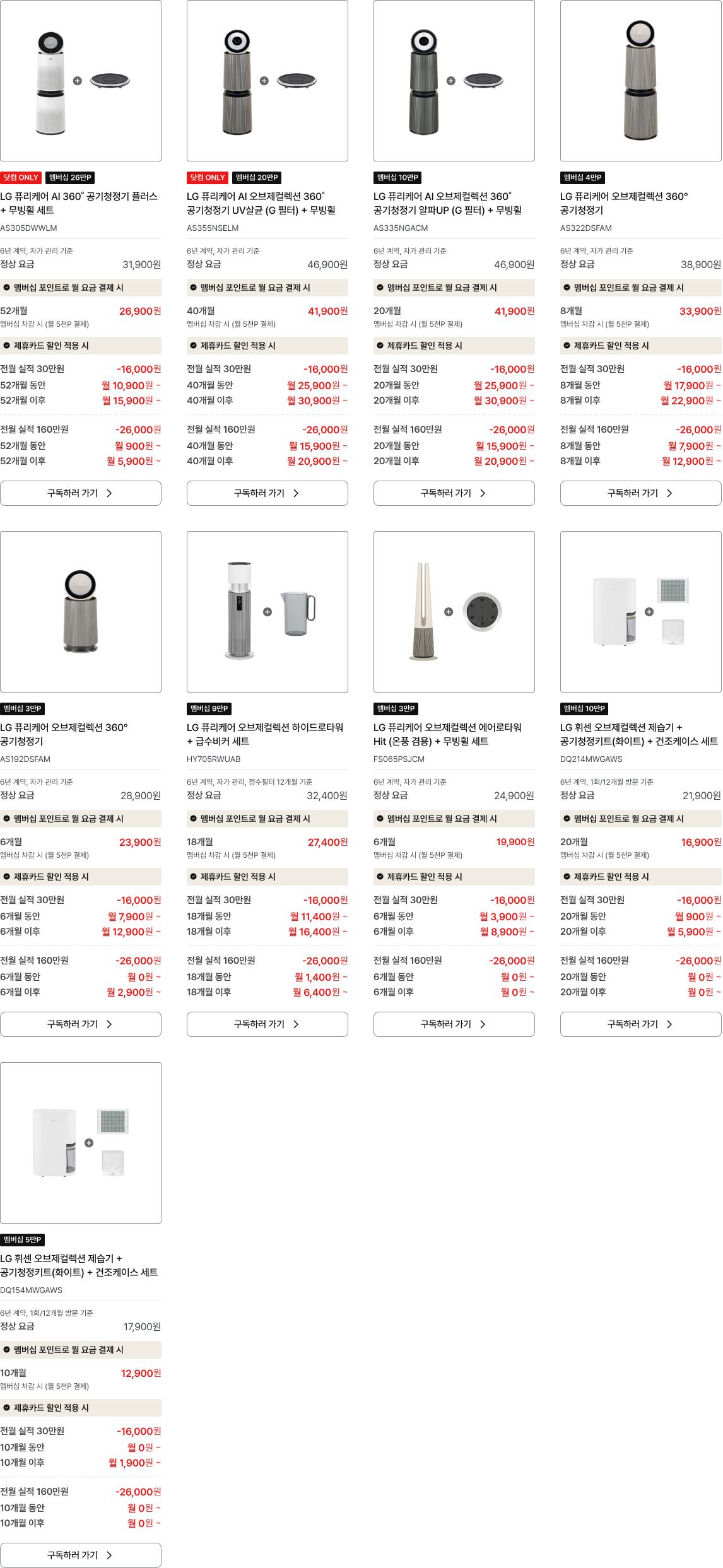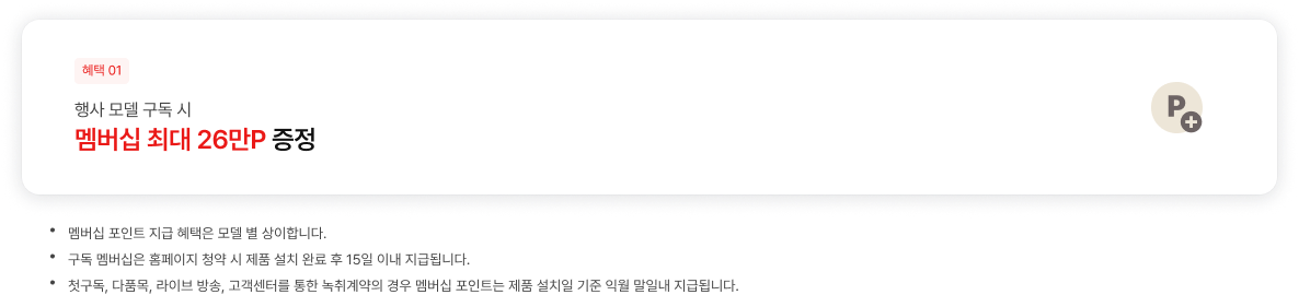 - 기존 결합할인은 신규 구독한 제품 6년 계약 시에만 해당되고 (TV : 5년 계약/ 로봇청소기 : 4년 계약), 기존 보유 제품의 계약기간 유지 시점까지 할인 적용되며, 제품군 별 할인율은 상이합니다.