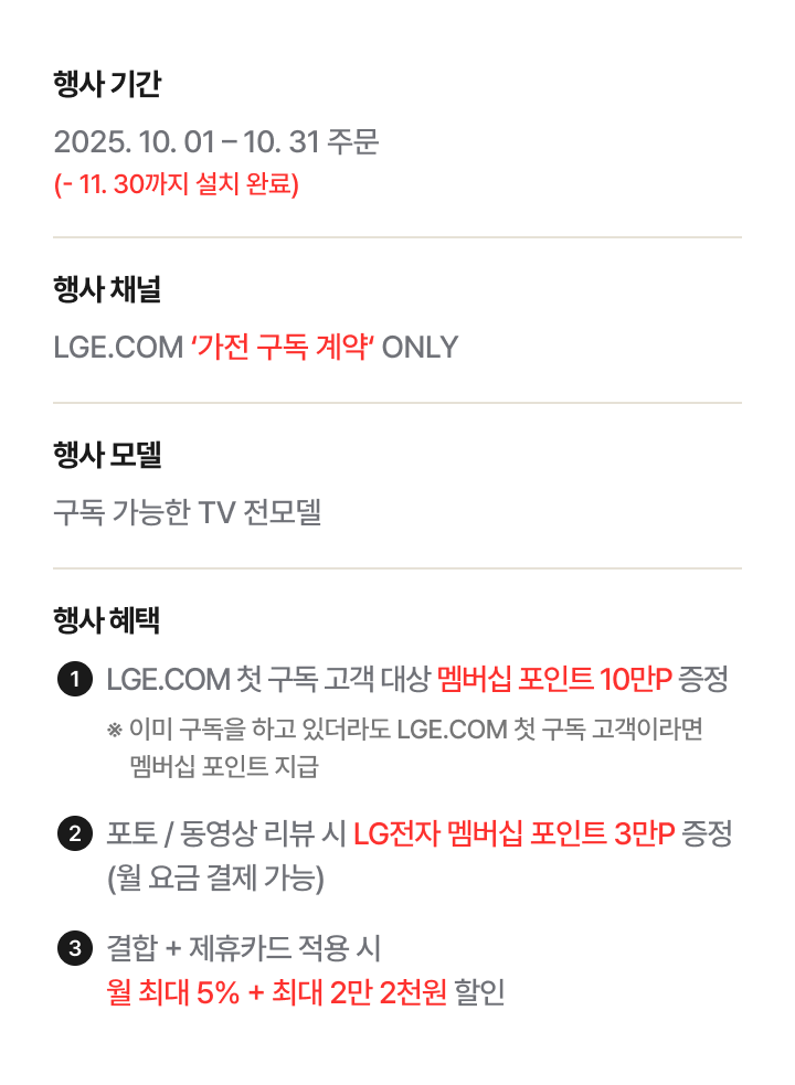 본 행사는 LGE.COM 단독 행사이며, 타 온라인 판매 채널 및 오프라인 판매처와는 무관합니다.