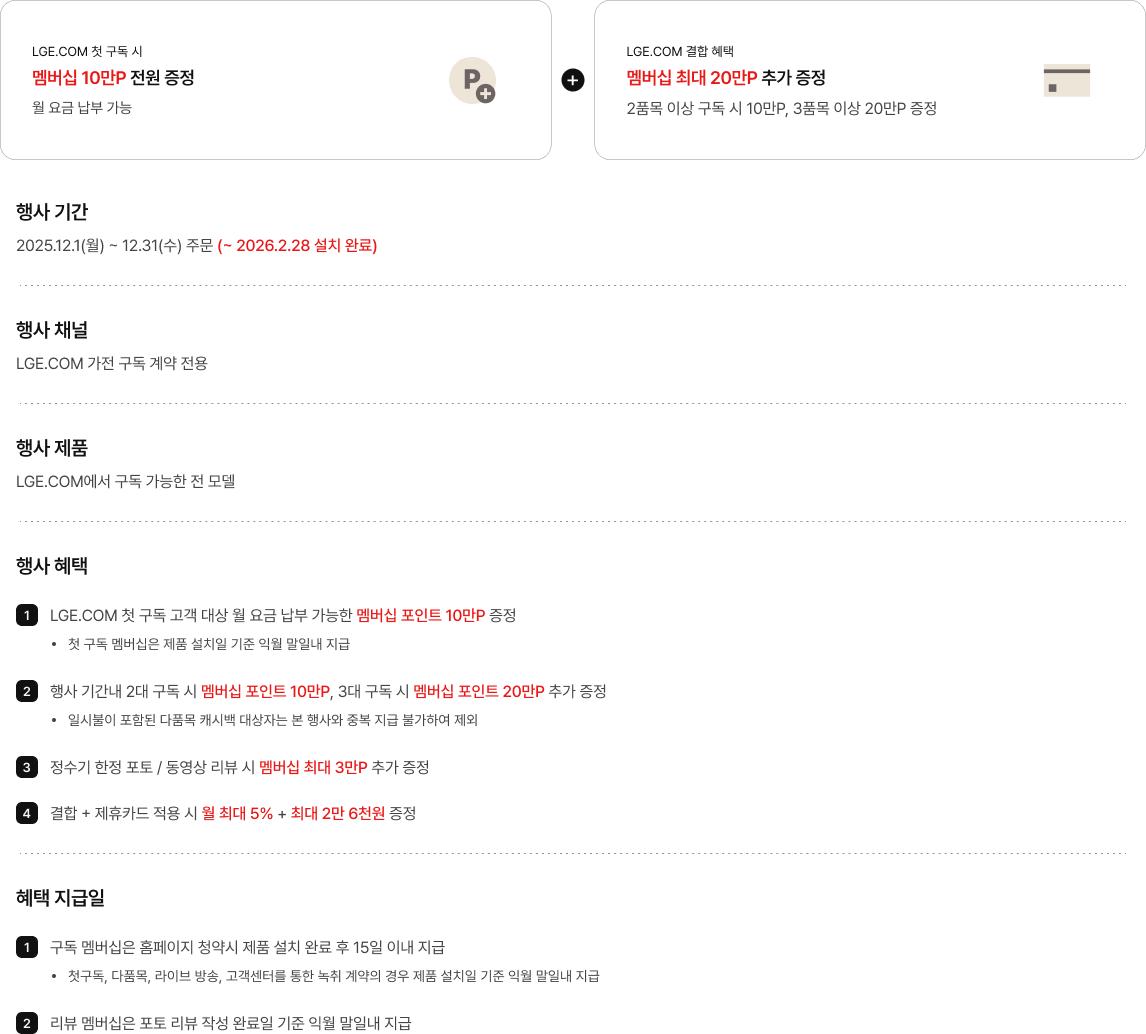 - LGE.COM 결합 혜택 멤버십 최대 20만P 추가 증정 2품목 이상 구독 시 10만P, 3품목 이상 20만P 증정