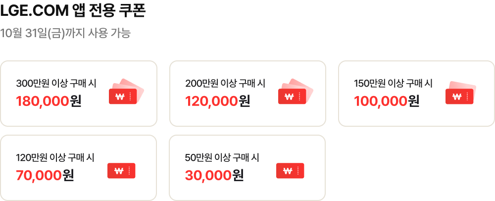 LGE.COM 신규 가입 시, 5% 웰컴 쿠폰을 받을 수 있으며, 최대 30만 원까지 할인됩니다.