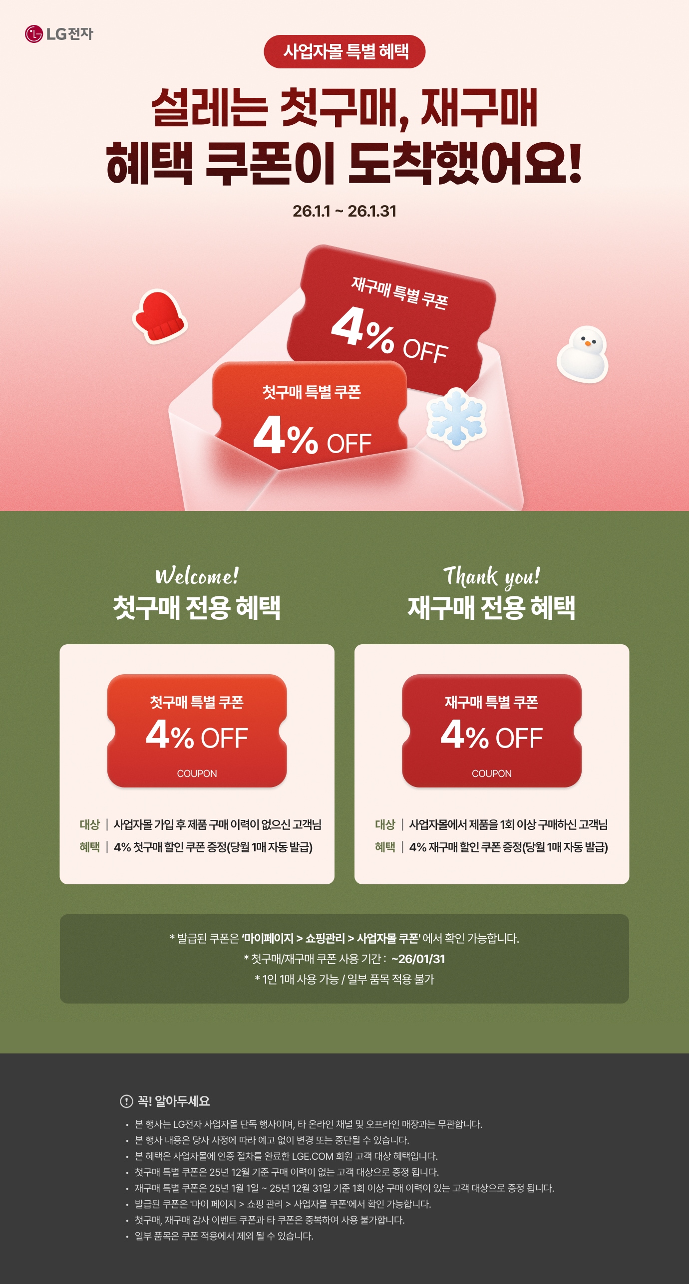 - 본 행사는 LG전자 사업자몰 단독 행사이며, 타 온라인 채널 및 오프라인 매장과는 무관합니다.