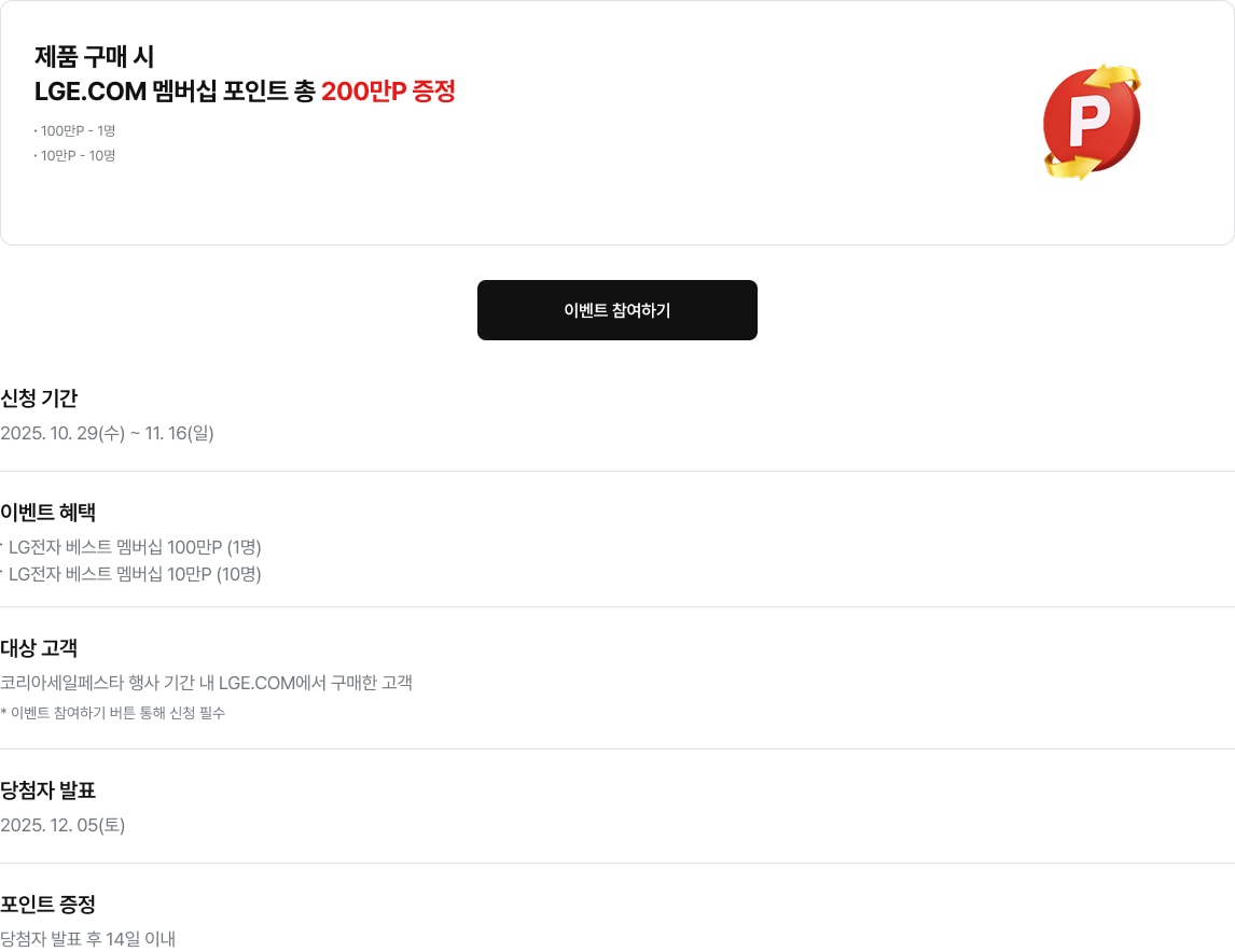 • 행사기간 (2025.10.29 ~ 11.16) 내 구매하신 가전 제품이 있을 경우 혜택이 지급되며, 소모품/구독은 이벤트 대상이 아닙니다.