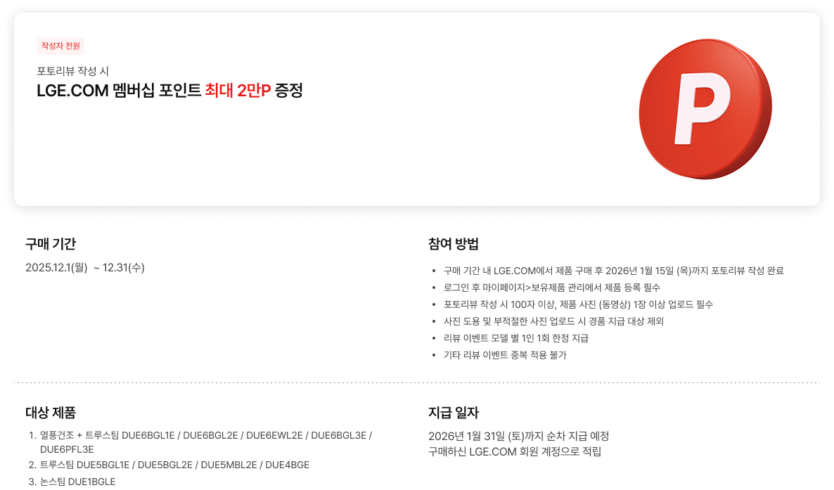 - 참여 방법 구매 기간 내 LGE.COM에서 제품 구매 후 2026년 1월 15일(목)까지 포토리뷰 작성 완료 로그인 후 마이페이지 > 보유제품 관리에서 제품 등록 필수 포토리뷰 작성 시 100자 이상, 제품 사진(동영상) 1장 이상 업로드 필수 사진 도용 및 부적절한 사진 업로드 시 경품 지급 대상 제외 리뷰 이벤트 모델 별 1인 1회 한정 지급 기타 리뷰 이벤트 중복 적용 불가 ※ 포토리뷰 이벤트 참여 시 고객 분의 리뷰를 활용하여 광고용을 제작하거나 리뷰 콘텐츠로 제작될 수 있습니다.