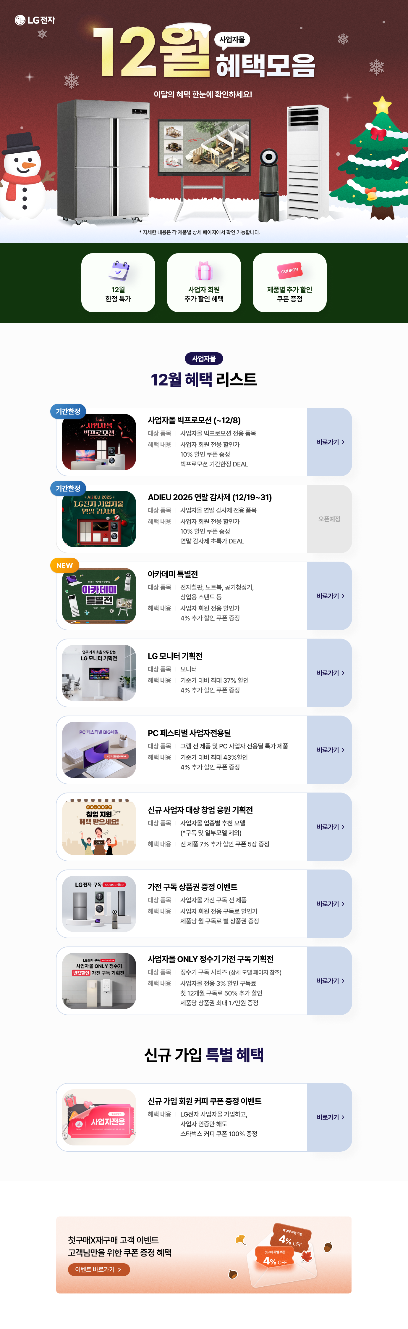 이달의 혜택 한눈에 확인하세요! 어두운 붉은색 배경에 눈이 내리고 있으며, 좌측에는 빨간 목도리를 한 눈사람이, 중앙에는 냉장고, 사이니지, 공기청정기, 에어컨이, 우측에는 장식된 크리스마스 트리가 배치되어 연말 분위기를 연출하고 있습니다.