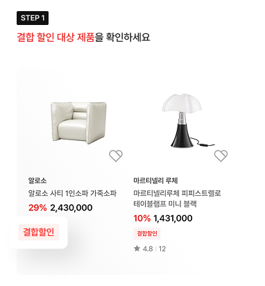 화면 예시: 온라인 몰 상품 목록 UI. 좌측에는 알로소 사티 1인소파 가죽소파가 29% 할인된 2,430,000원에 판매 중이며 '결합할인' 태그가 붙어있음. 우측에는 마르티넬리 루체 피피스트렐로 테이블램프 미니 블랙이 10% 할인된 1,431,000원에 판매 중이며 '결합할인' 태그가 붙어있음.