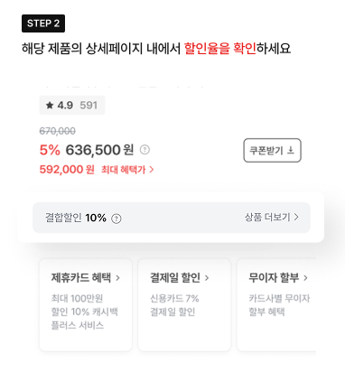 화면 예시: 상품 상세페이지 가격 정보 UI. 판매가 636,500원 옆에 '쿠폰받기' 버튼이 위치함. 하단 혜택 리스트에서 '결합할인 10%' 항목이 강조되어 있음.