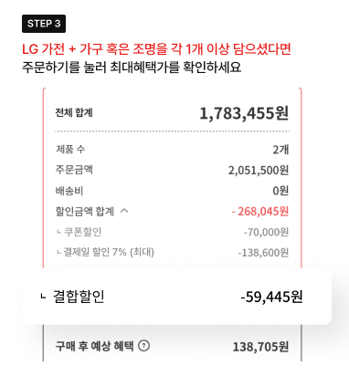 LG 가전 + 가구 혹은 조명을 각 1개 이상 담으셨다면 주문하기를 눌러 최대혜택가를 확인하세요