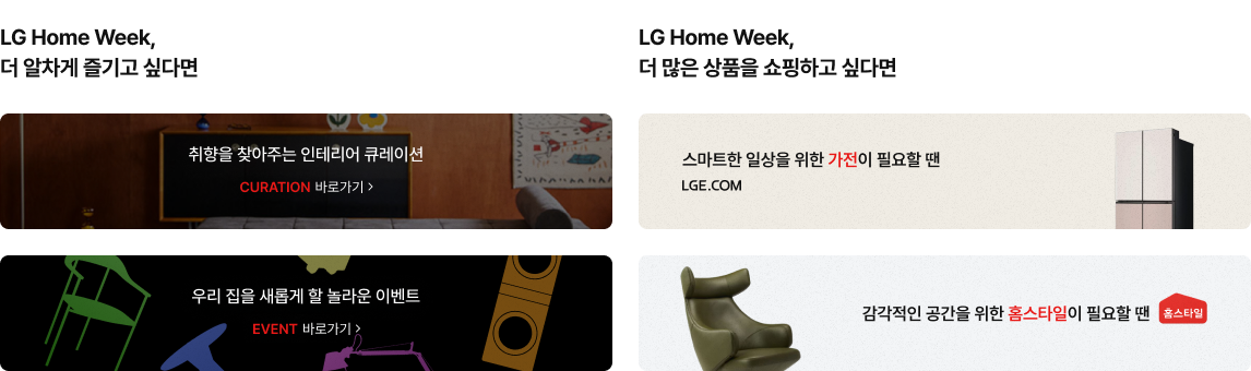 LG전자는 고객의 일상이 더 스마트하고 아름답고 편안해질 수 있도록 삶의 다양한 순간에 어울리는 공간의 의미와 가치를 새롭게 제안합니다.