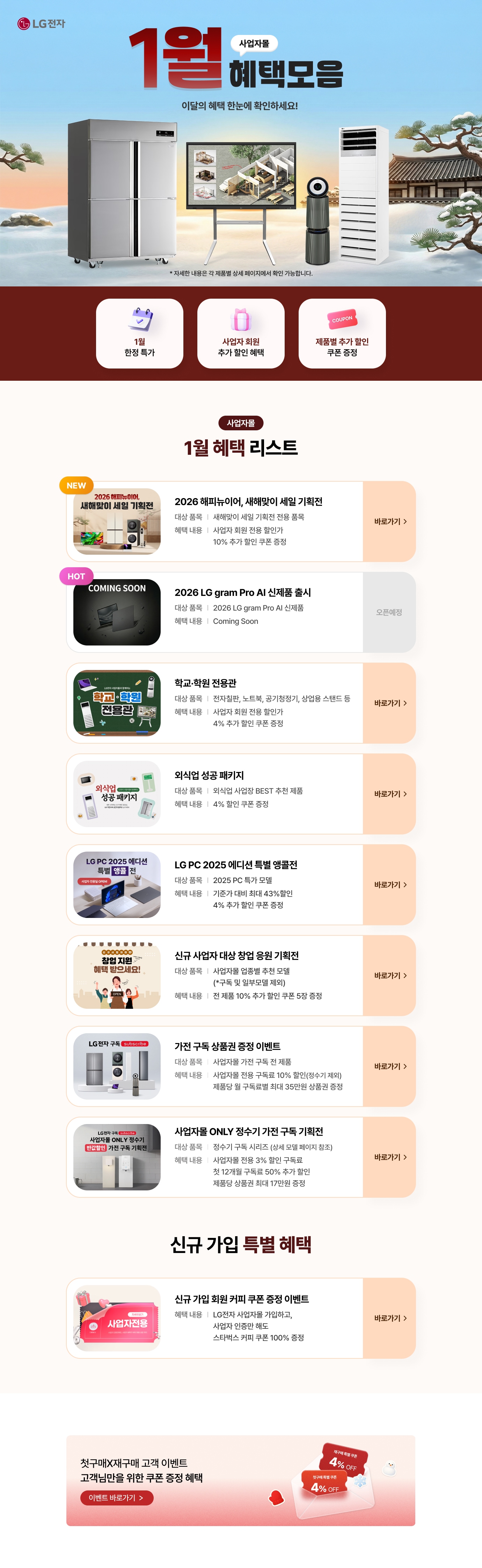 이달의 혜택 한눈에 확인하세요! 밝은 배경에 일출이 보이며 눈이 쌓여있으며, 워시타워, 세탁기, 식기세척기, 냉장고, 에어컨 등이 중앙에 배치되어있고, 새해 분위기를 연출하고 있습니다.