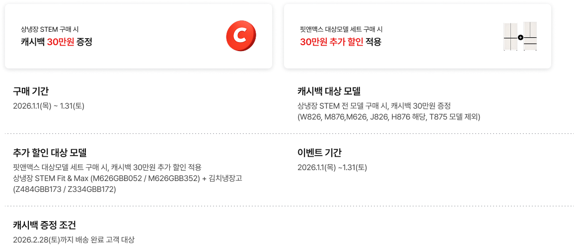 상냉장 STEM 전 모델 구매 시, 캐시백 30만원 증정 (W826, M876, M626, J826, H876 해당, T875 모델 제외)