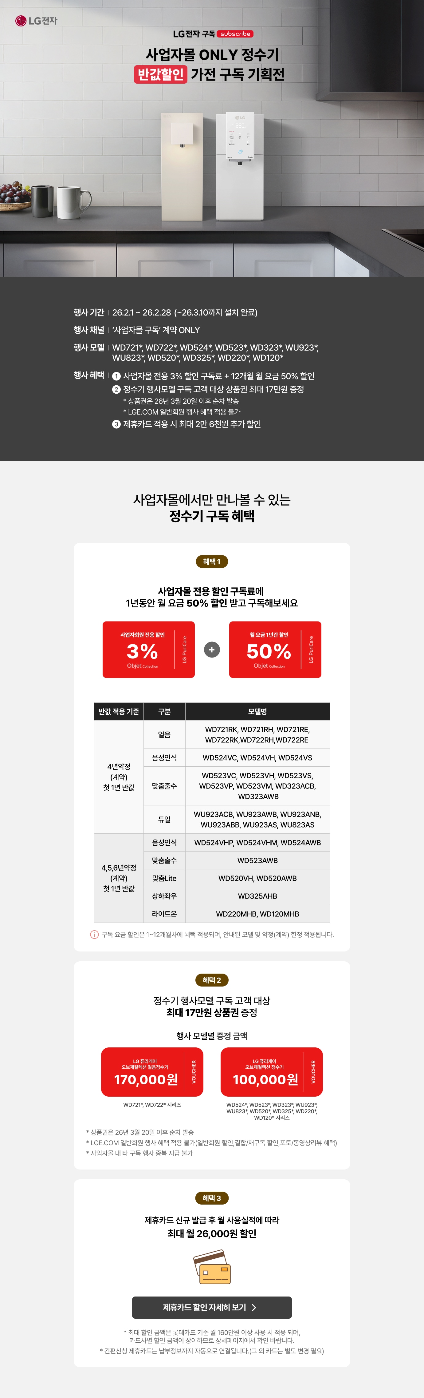 - 2. 정수기 행사모델 구독 고객 대상 상품권 최대 17만원 증정 (상품권은 26년 3월 20일 이후 순차 발송, LGE.COM 일반회원 행사 혜택 적용 불가)
