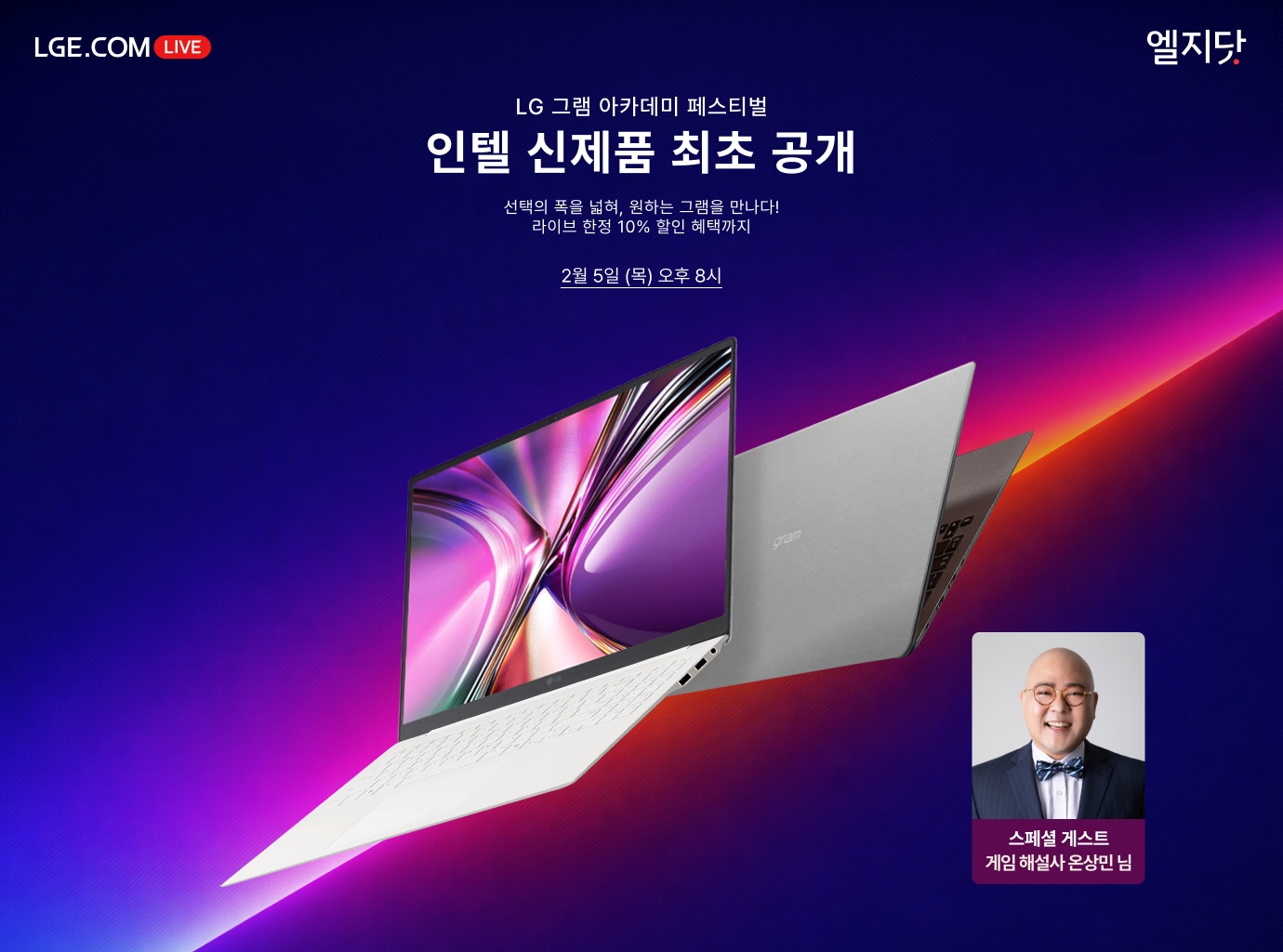 2월 5일 (목) 오후 8시보라색과 붉은색 조명이 어우러진 배경 중앙에 화면을 펼친 흰색 그램 노트북과 덮개를 닫은 회색 그램 노트북 제품 이미지가 입체적으로 배치되어 있음.