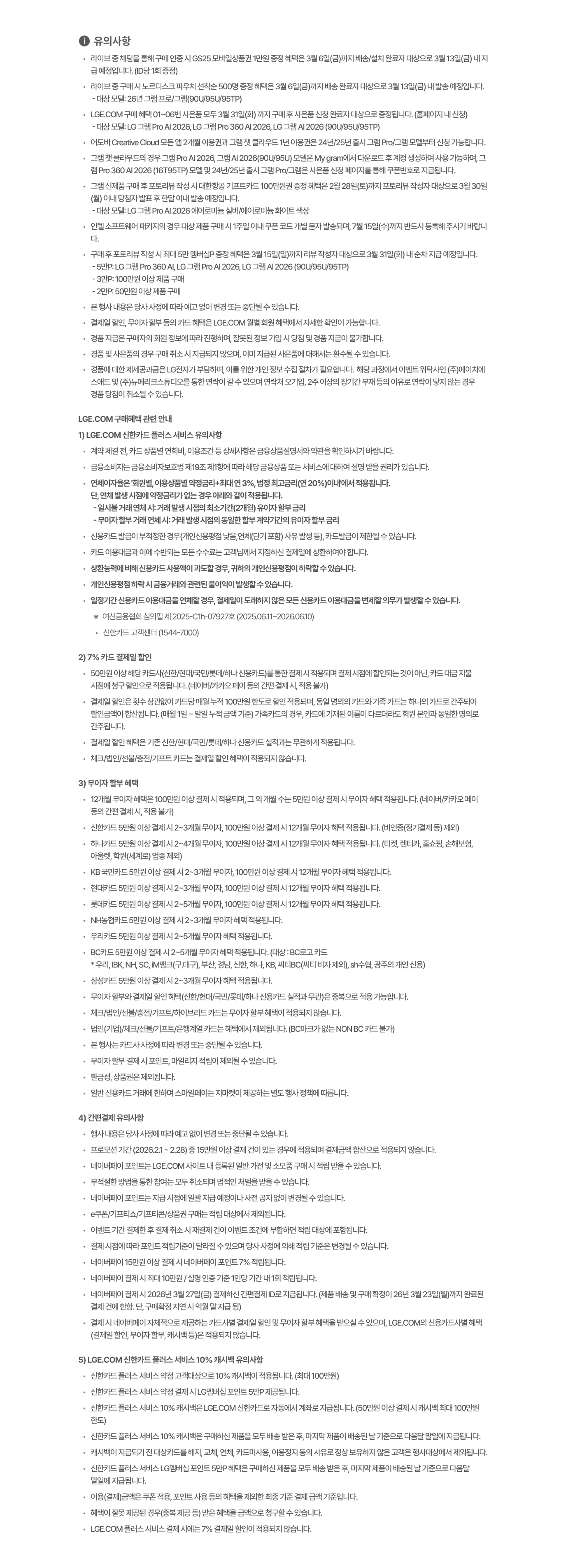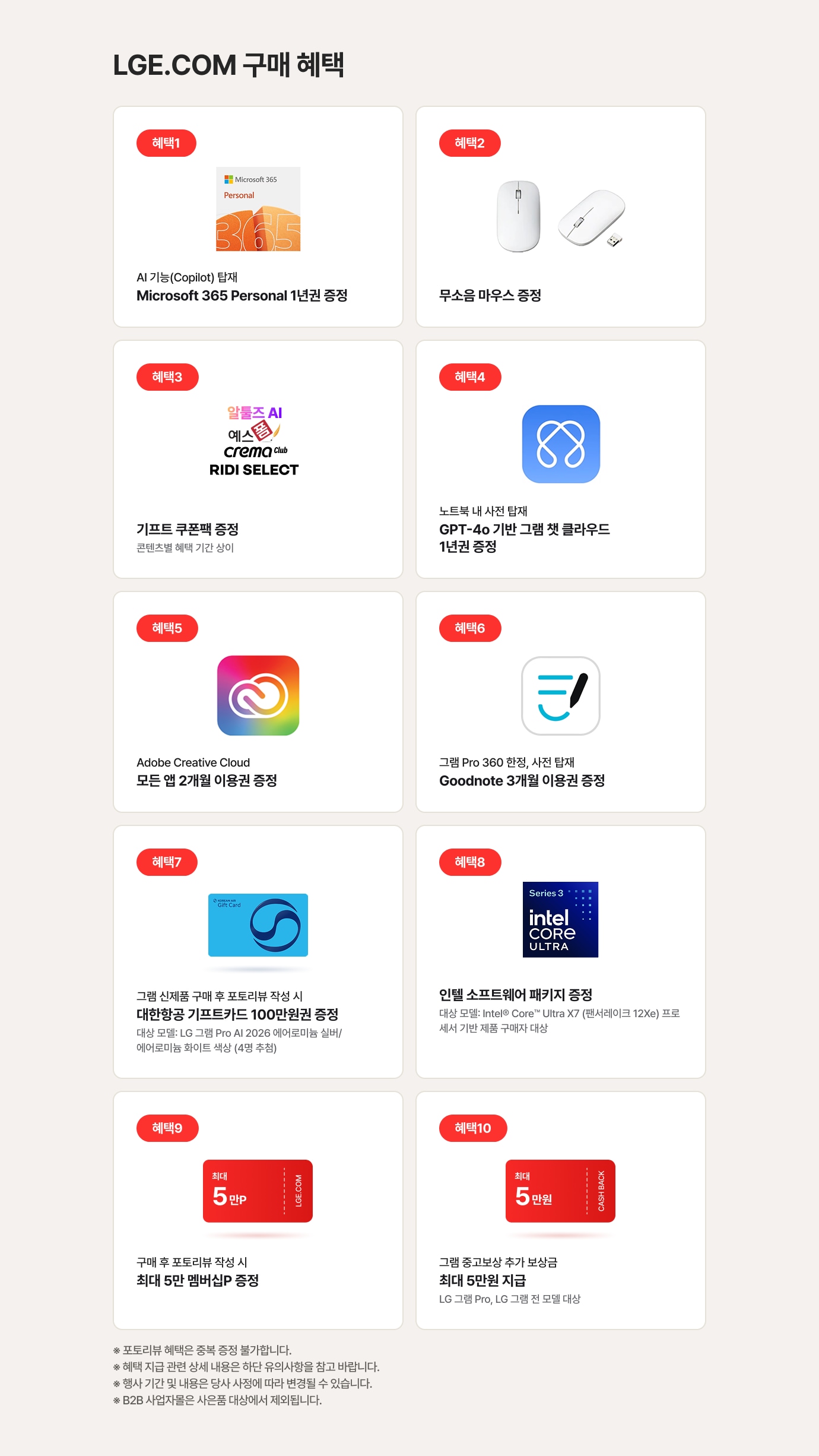 대한항공 기프트카드 100만원권 증정대상 모델: LG 그램 Pro AI 2026 에어로미늄 실버/에어로미늄 화이트 색상 (4명 추첨)