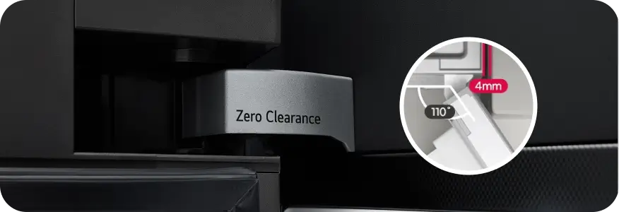 일반적인 냉장고는 문을 열 때 하나의 힌지축을 중심으로 회전합니다. 그로 인해 본체보다 앞으로 돌출되고, 그만큼 가구장과의 간격을 둬야 합니다. 반면, Fit & Max 냉장고에 적용된 제로 클리어런스 힌지는 두 개의 축을 이용해 냉장고 문이 본체 안쪽으로 회전하기 때문에 가구장에 단 4mm까지 밀착해도 벽에 부딪히지 않습니다. 김치냉장고 등 두 대 이상의 Fit & Max를 나란히 둘 때도 8mm의 간격만 있으면 되기에, 마치 한 제품 같은 일체감을 연출할 수 있습니다.