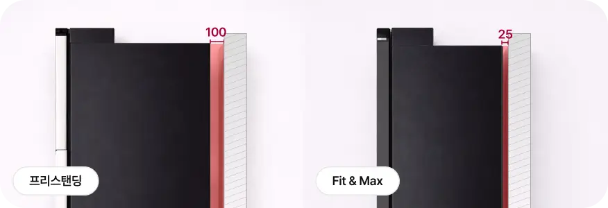 일반적으로 냉장고는 열을 뒷면과 옆면으로 배출하는 구조이기 때문에 설치 시 뒷면은 100mm 이상, 옆면은 50mm 이상의 간격을 두는 것이 바람직합니다. 반면, Fit & Max 냉장고는 하단에서 정면으로 열을 배출하는 전방 방열기술이 적용되어 뒷면과 옆면의 간격을 거의 밀착하는 수준으로 최소화할 수 있습니다. 따라서 기존 가구장 환경에서도 돌출을 줄인 설치가 가능합니다.