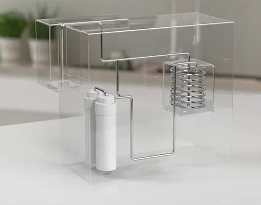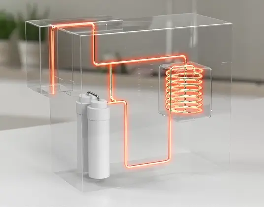 순간 냉각은 냉각수에 의해 차가워진 냉각 코일을 통과하며 열교환으로 물을 냉각하는 방식입니다.