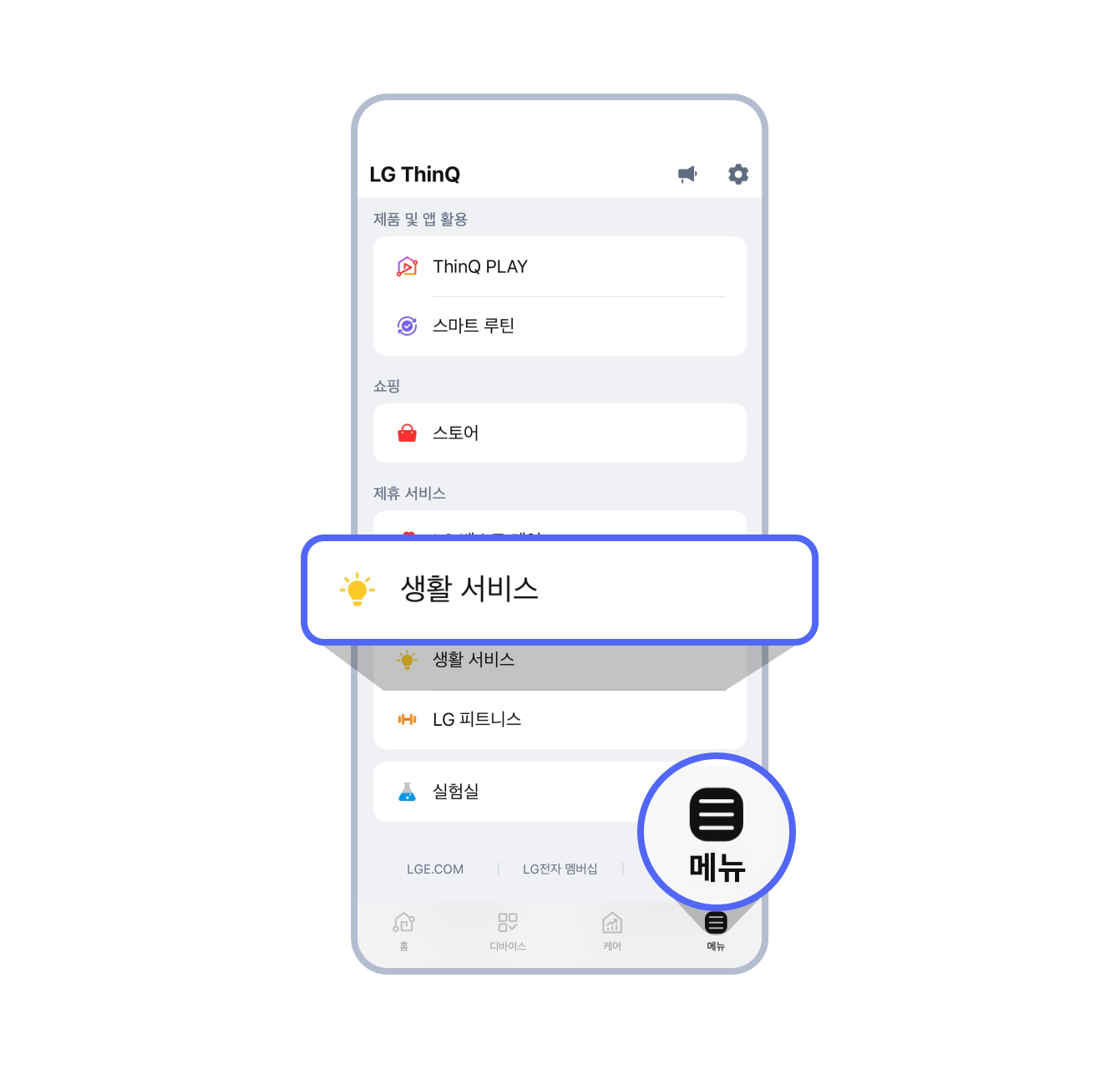 ThinQ 앱에서 ‘메뉴’ 탭으로 이동하여 ‘제휴 서비스’ 영역의 ‘생활 서비스’ 선택