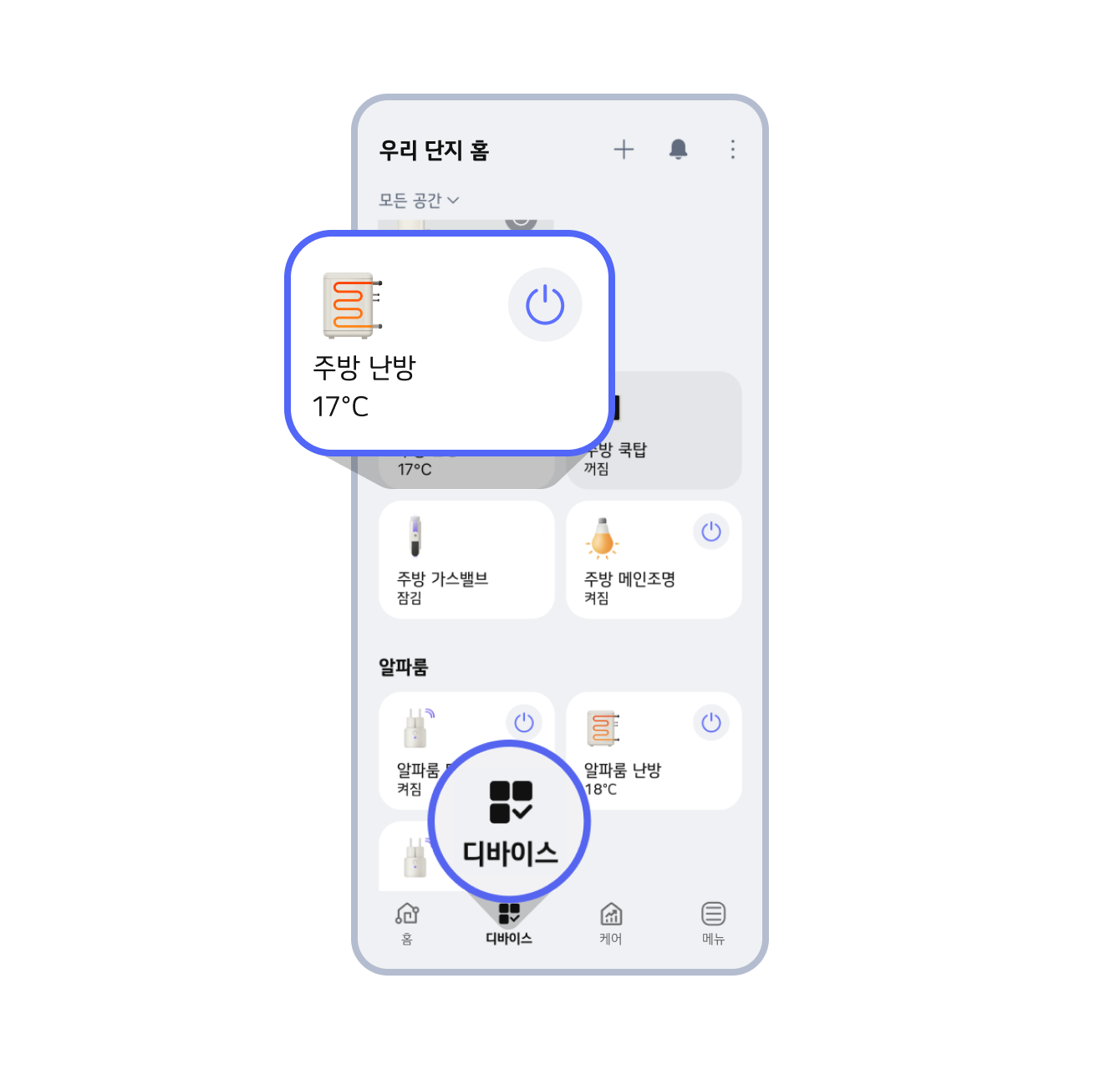 ■ 우리 단지 통합 버전 확인 방법우리 단지 통합 버전은 별도의 앱으로 이동하지 않고, 디바이스 탭에서 바로 ‘난방’을 제어할 수 있습니다.