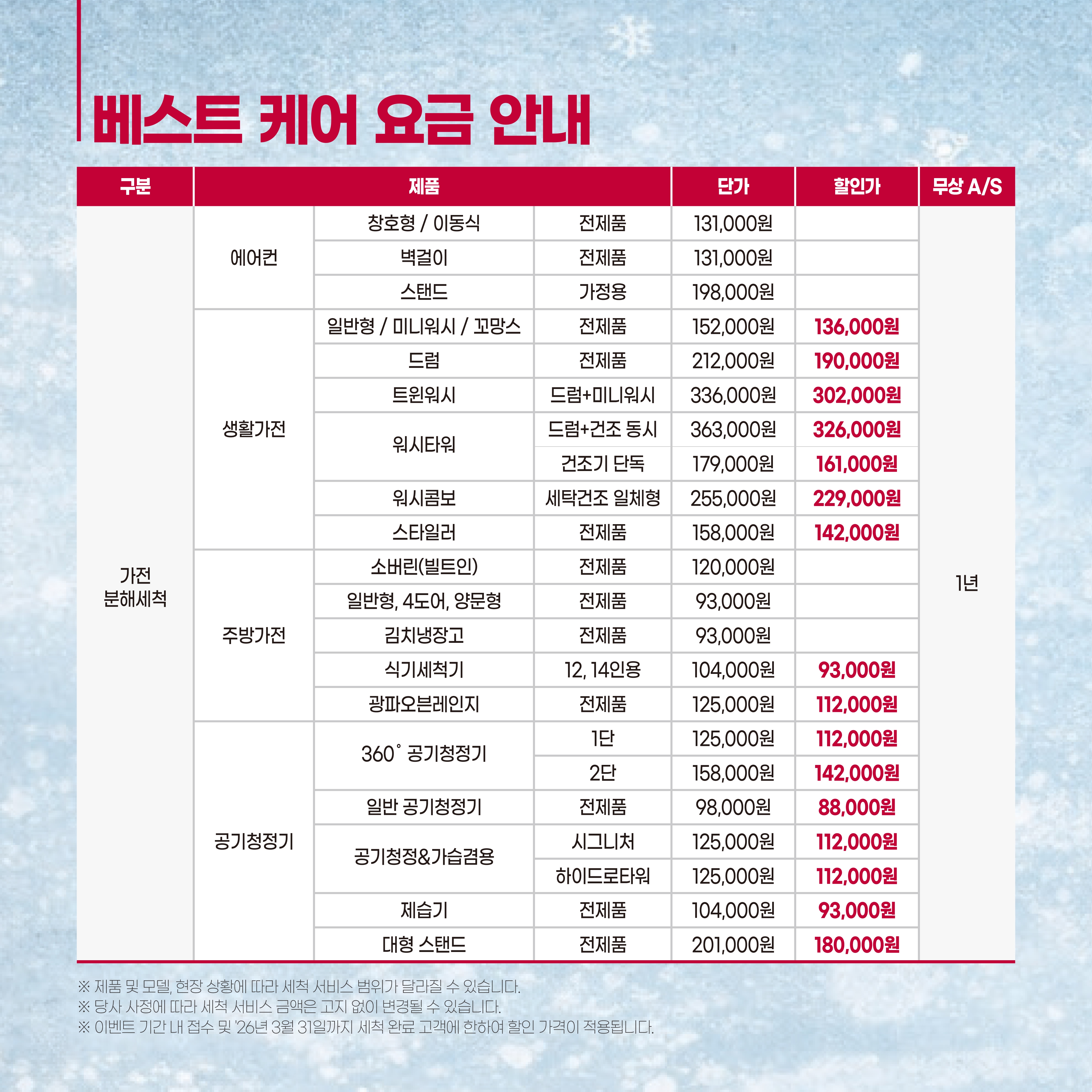 베스트 케어 요금 안내 구분 제품 단가 할인가 무상A/S 가전 분해세척 에어컨 창호형/이동식 전제품 131,000 1년 벽걸이 전제품 131,000 스탠드 가정용 198,000 생활가전 일반형/미니워시/꼬망스 전제품 152,000원 136,000원 드럼 전제품 212,000원 190,000원 트윈워시 드럼+미니워시 336,000원 302,000원 워시타워 드럼+건조 동시 363,000원 326,000원 건조기 단독 179,000원 161,000원 워시콤보 세탁건조 일체형 255,000원 229,000원 스타일러 전제품 158,000원 142,000원 주방가전 소버린(빌트인) 전제품 120,000원 일반형, 4도어, 양문형 전제품 93,000원 김치냉장고 전제품 93,000원 식기세척기 12, 14인용 104,000원 광파오븐레인지 전제품 125,000원 112,000원 공기청정기 360도 공기청정기 1단 125,000원 112,000원 2단 158,000원 142,000원 일반 공기청정기 전제품 98,000원 88,000원 공기청정&가습겸용 시그니처 125,000원 112,000원 하이드로타워 125,000원 112,000원 제습기 전제품 104,000원 93,000원 대형 스탠드 전제품 201,000원 180,000원