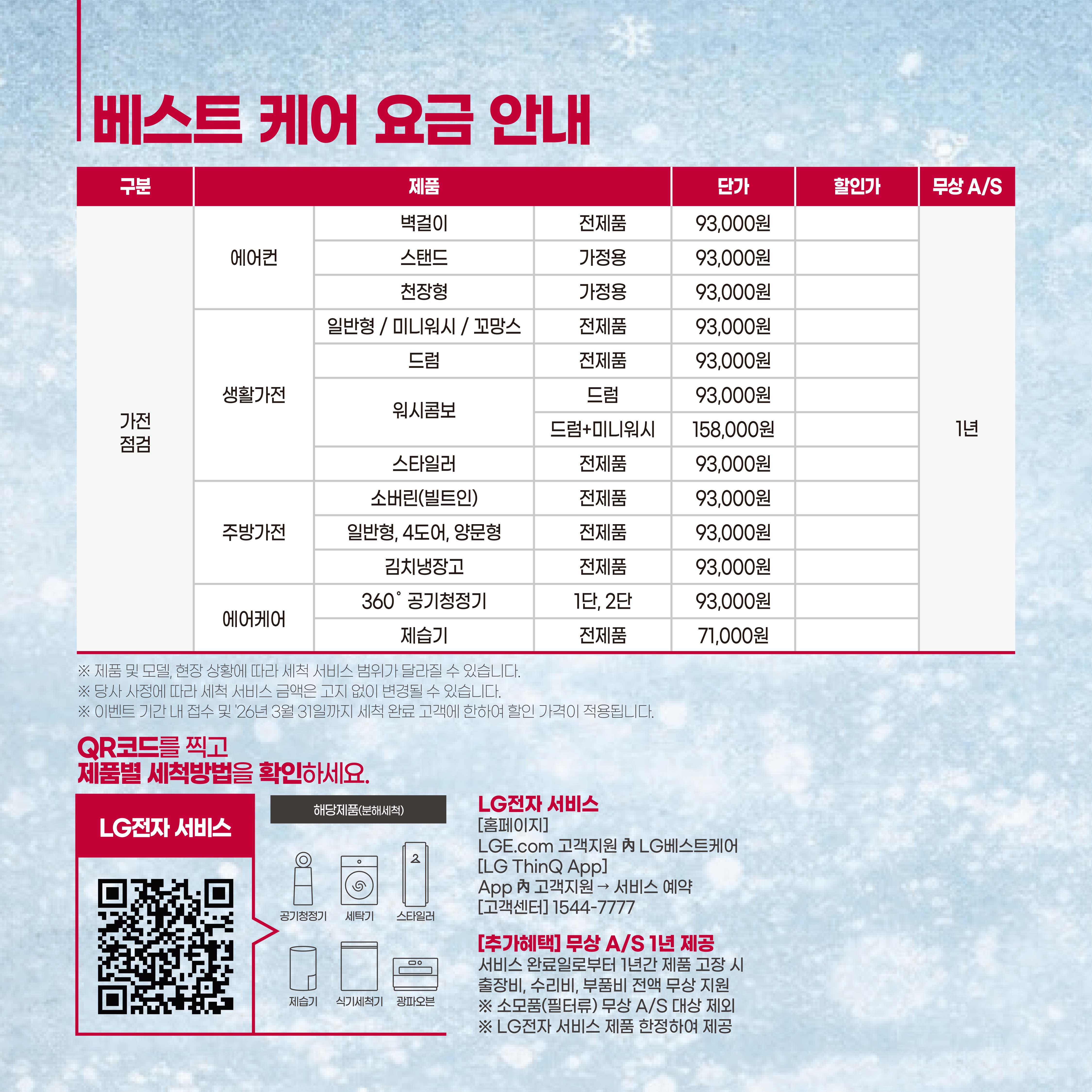 베스트 케어 요금 안내 구분 제품 단가 할인가 무상A/S 가전 점검 에어컨 벽걸이 전제품 93,000원 1년 스탠드 가정용 93,000원 청장형 가정용 93,000원 생활가전 일반형/미니워시/꼬망스 전제품 93,000원 드럼 전제품 93,000원 워시콤보 드럼 93,000원 드럼+미니워시 158,000 스타일러 전제품 93,000원 주방가전 소버린(빌트인) 전제품 93,000원 일반형, 4도어, 양문형 전제품 93,000원 김치냉장고 전제품 93,000원 에어케어 360도 공기청정기 1단, 2단 93,000원 제습기 전제품 71,000원