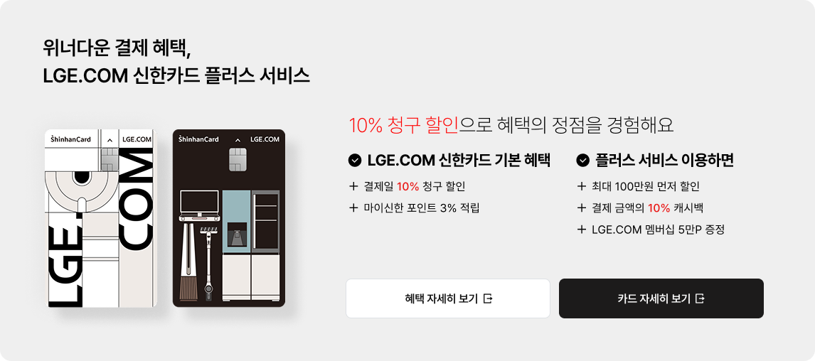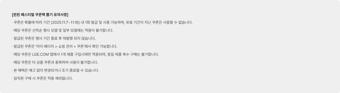 - 해당 쿠폰은 LGE.COM 앱에서 1개 제품 구입시에만 적용되며, 동일 제품 복수 구매는 불가합니다.