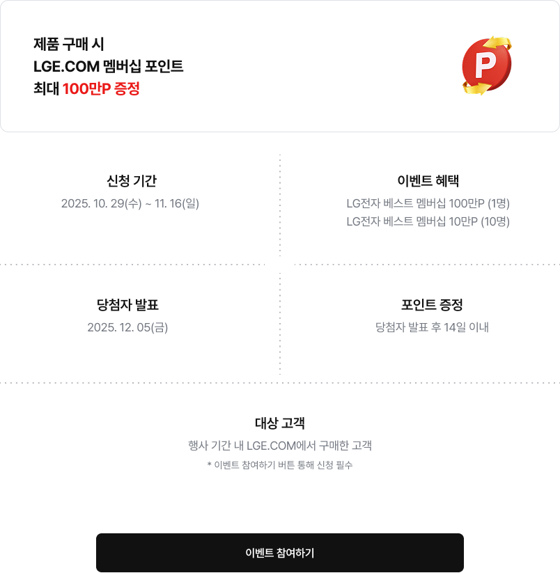 - 이벤트 혜택: LG전자 베스트 멤버십 100만P (1명), LG전자 베스트 멤버십 10만P (10명)